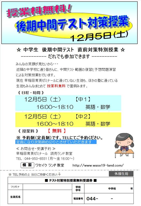 後期中間テスト対策特別授業【授業料無料】中学1・2年生